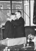 De heer F. D. G. Klinkenberg werd geinstalleerd als burgemeester van Putten. Een meisje van de Nationale Jeugdstorm biedt bloemen aan.