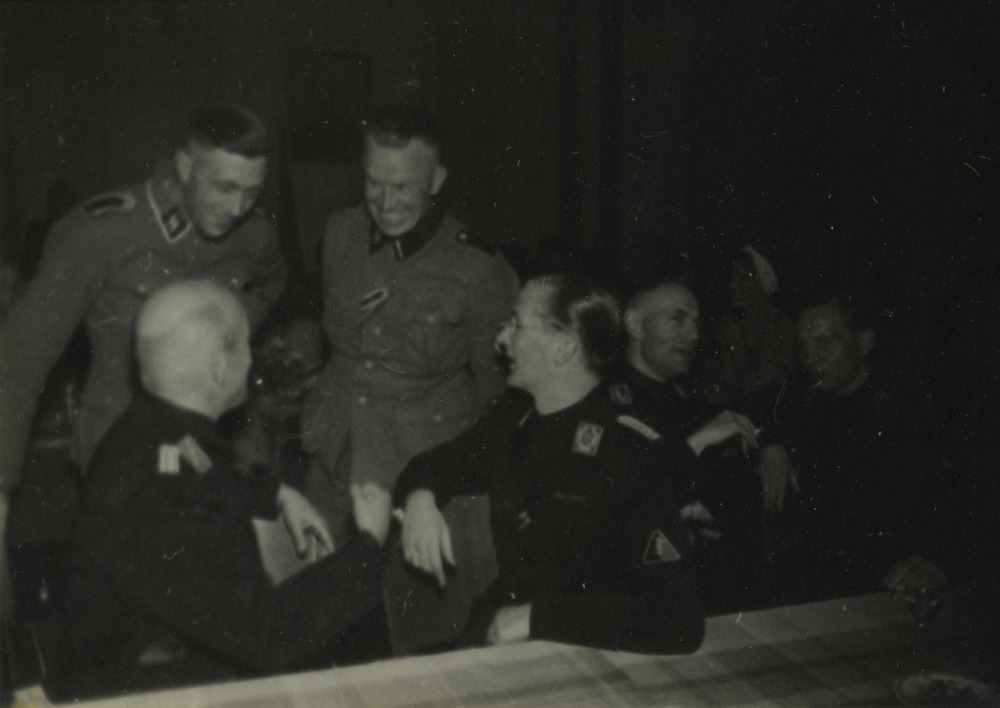 Bijeenkomst in Bellevue van leden en hun familie, van het Vrijwilligerslegioen Nederland met verlof. Cino, G.H. 1894 – 1967. Cino werkte sinds midden jaren ’20 voor Het Leven. In december 1940 was Cino lid geworden van de NSB. Het Leven werd eind 1941 opgeheven en in juli 1942 krijgt Cino een baan bij de Fotodienst der N.S.B. Zijn foto’s verschijnen in Volk en Vaderland, Fotonieuws, de Zwarte Soldaat en Storm SS. Op 28 mei 1945 werd hij gearresteerd.