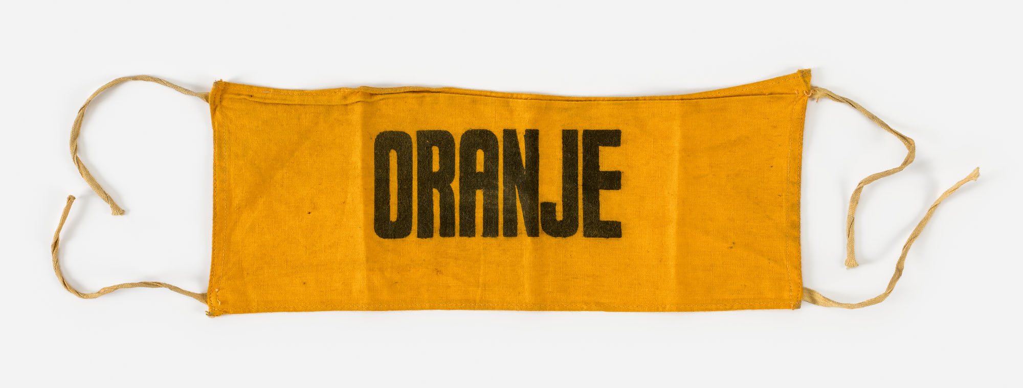 Deze oranje mouwband, met het opschrift 'ORANJE', is gedragen door leden van het Nederlandse verzet tijdens de Tweede Wereldoorlog. De band symboliseerde loyaliteit aan het Koninklijk Huis en het verzet tegen de Duitse bezetting. Het dragen van deze mouwband was een daad van openlijk verzet, vooral tijdens en na de bevrijding van Nederland.