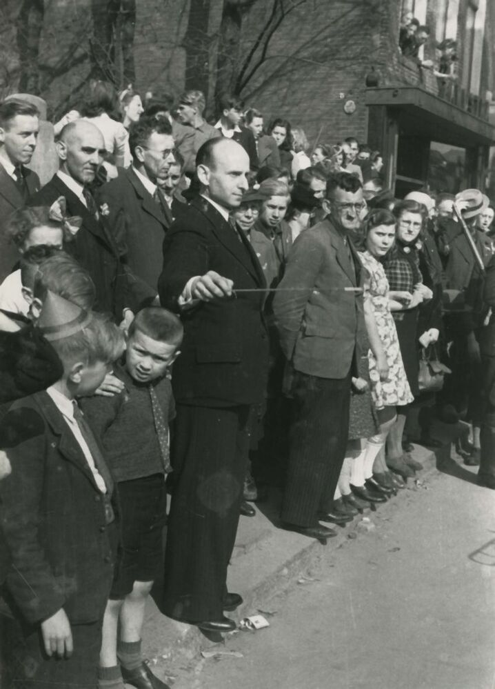 Op 15 april 1945 werd Leeuwarden door de Canadese Strijdkrachten bevrijd. Hier staat een groep inwoners van de Friese hoofdstad voor het Burmaniahuis op de bevrijders te wachten.