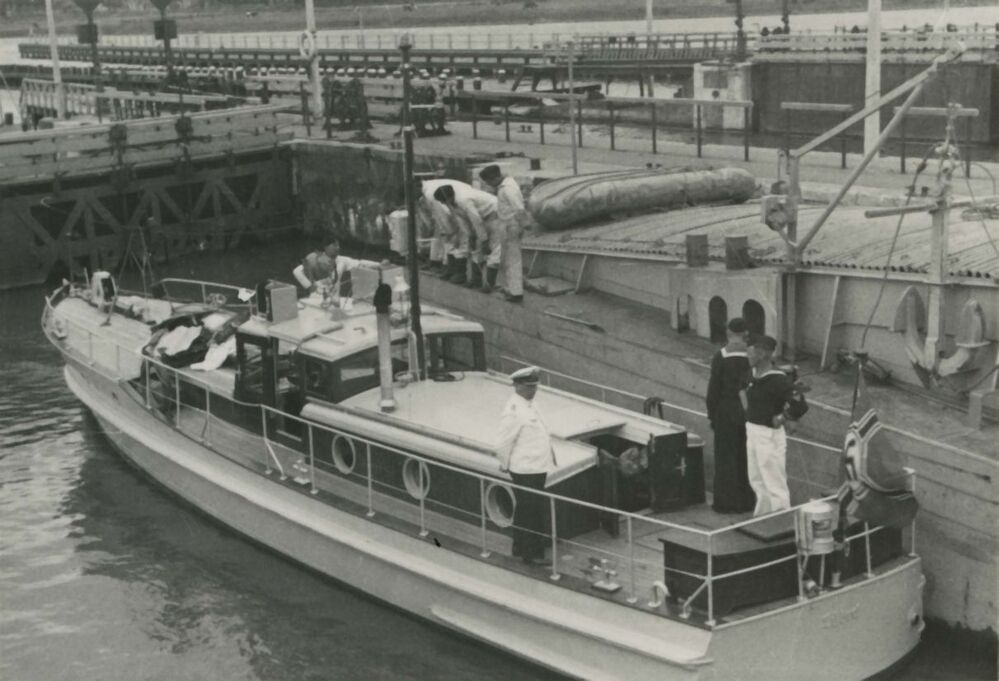 Na de capitulatie, deze werd op 15 mei 1940 door Generaal Winkelman in Rijsoord getekend, kwam Nederland vijf jaar onder Duits gezag te staan. Toch ging het dagelijks leven voor zo goed en kwaad als het ging, niet alleen voor de Nederlanders, maar ook voor de bezetter door. Hier ziet men een Duitse patrouilleboot in de Tjerk Hiddessluis in Harlingen.