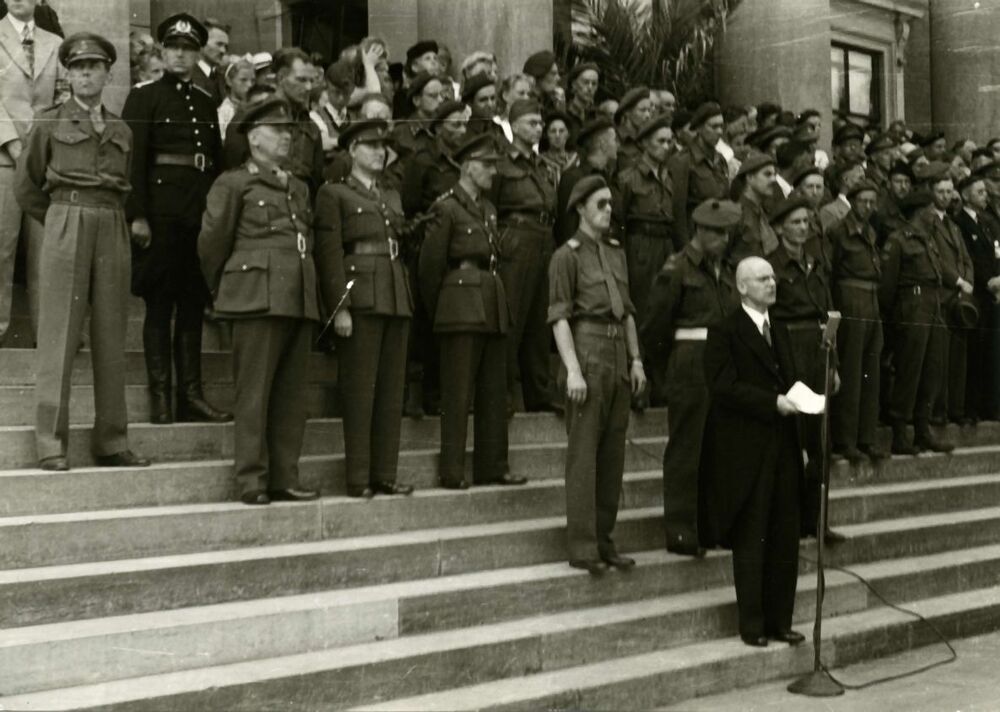 De N.B.S. hield op 14 juli 1945 haar afscheidsparade op het Wilhelminaplein te Leeuwarden. De parade werd afgenomen door Prins Bernhard, de staf van de Canadese Strijdkrachten en de lokale overheden. Achter de microfoon staat de waarnemend Commissaris van de Koninging Mr. A.W. Haan.