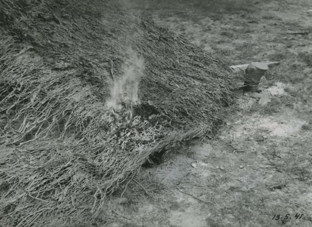 Tijdens een brandweeroefening is een mat in brand gestoken om te testen op welke manier het vuur het beste gedoofd kan worden.
