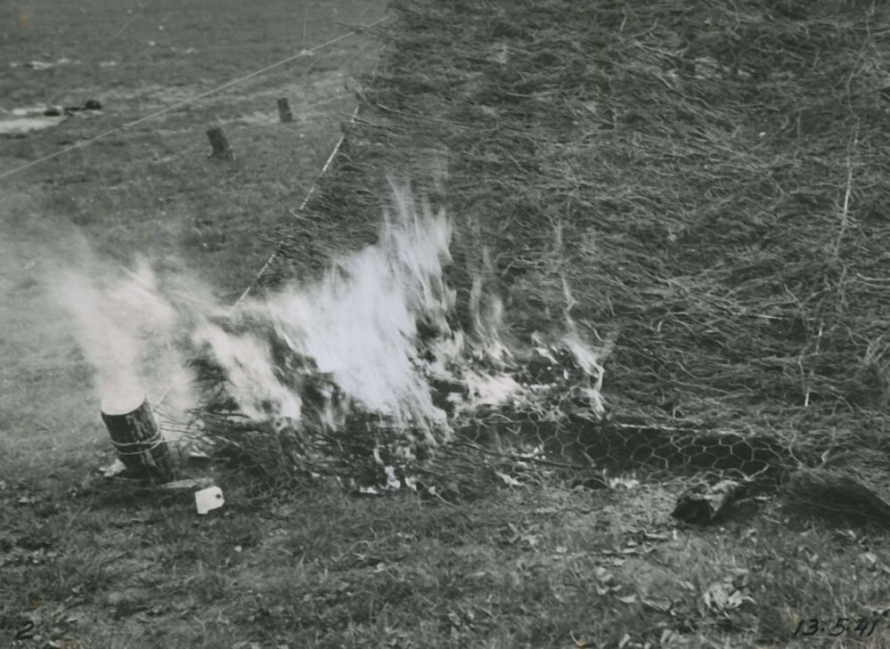 Tijdens een brandweeroefening is een mat in brand gestoken om te testen op welke manier het vuur het beste gedoofd kan worden.