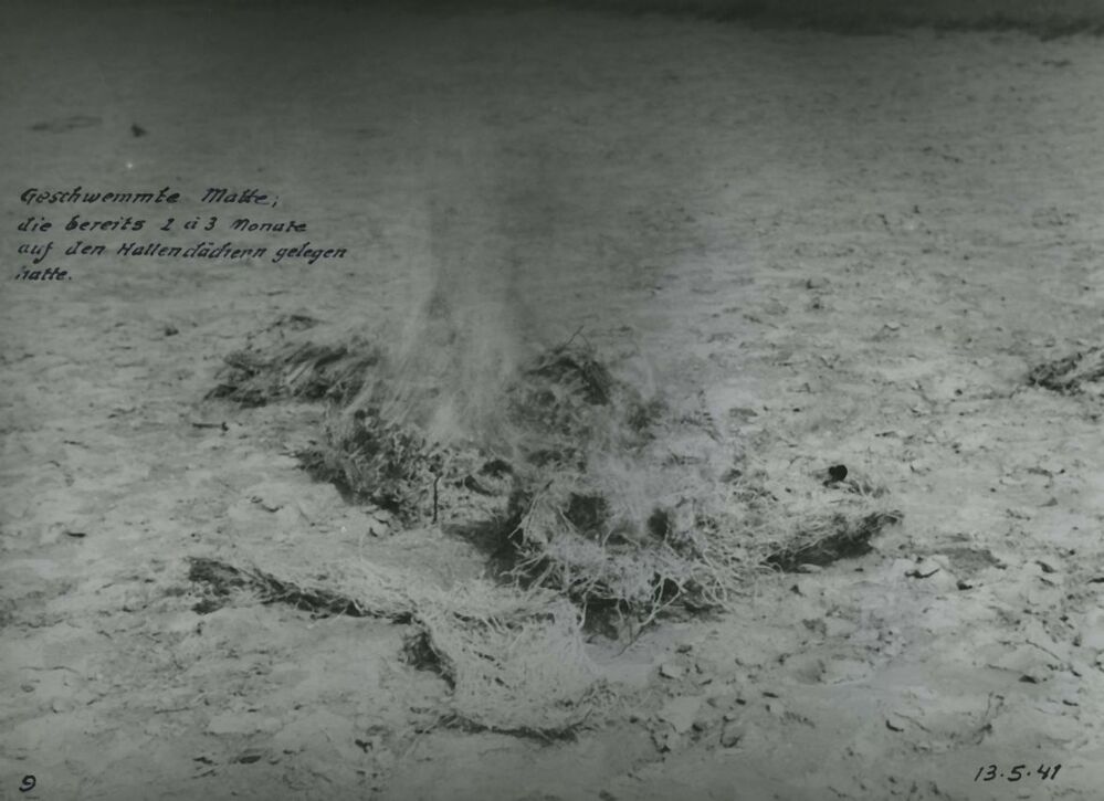 Tijdens een brandweeroefening is een mat in brand gestoken om te testen op welke manier het vuur het beste gedoofd kan worden. De mat was behandeld met een brandwerend middel en twee à drie maanden op het dak van een loods gelegen. Tekst op de foto: Geschwemmte Matte/ die bereits 2 à 3 Monate auf den Hallendächern gelegen hatten.