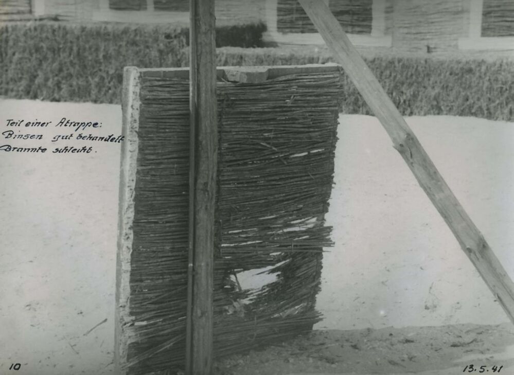 Tijdens een brandweeroefening is een trede van een trap in de brand gestoken om te testen op welke manier het vuur het beste gedoofd kan worden. Tekst op de foto: Teil einer Treppe: Binsen gut behandelt. Brannte slecht.