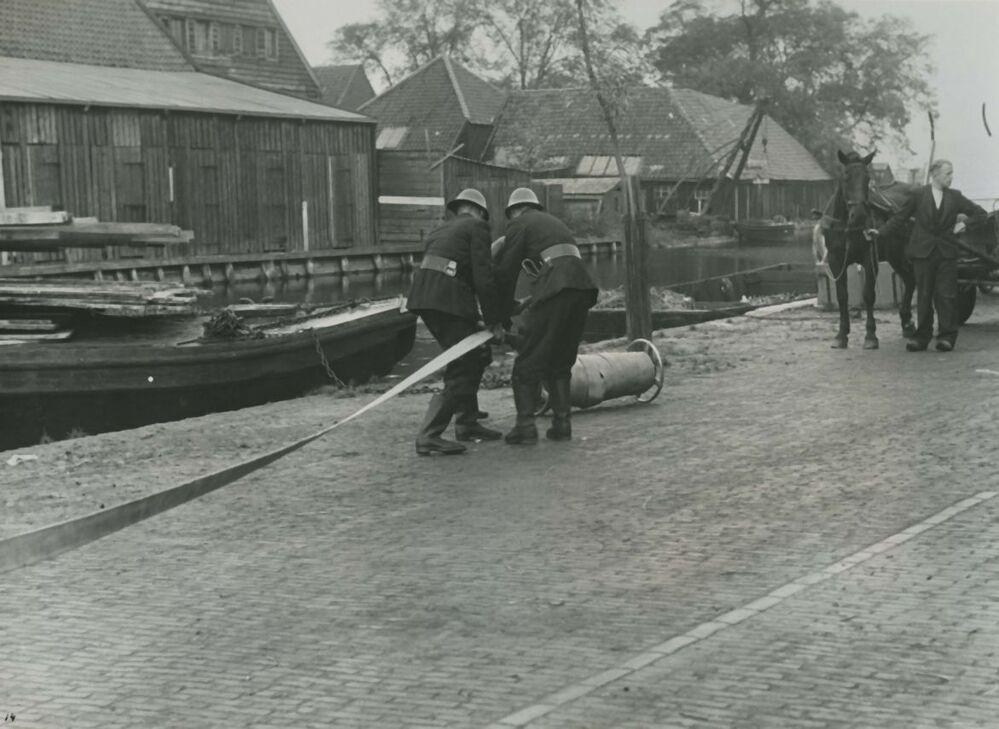 De brandweer van Purmerend hield op 14 oktober 1941 een grote oefening in het dorp. Twee brandweermannen zijn druk bezig om de slangen uit te rollen.