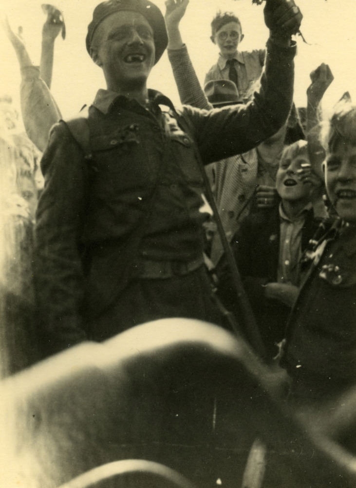 Foto van een vrouw, die proeft van een maaltijd op een bord. Zij is omringd door lachende militairen. Opgenomen in Amsterdam, in 1945.