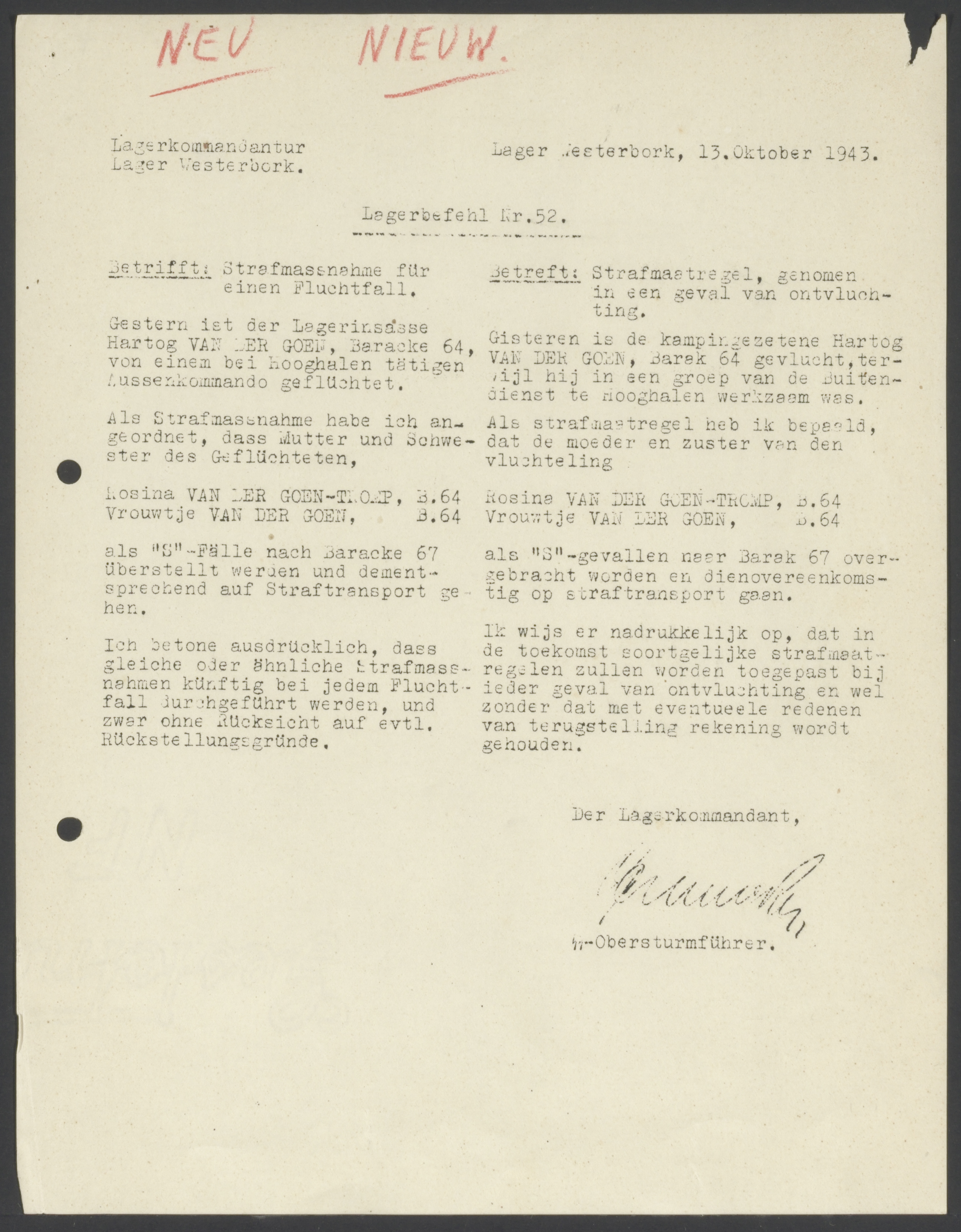 Lagerbefehl No. 52 Datum: 1943-10-13 Plaats: Westerbork, kamp Onderwerp: Strafmaatregel, genomen in geval van ontvluchting Betreft Hartog van der Goen, barak 64, gevlucht terwijl hij in de buitendienst werkzaam was. Zijn moeder en zus werden naar de strafbarakken overgeplaatst.