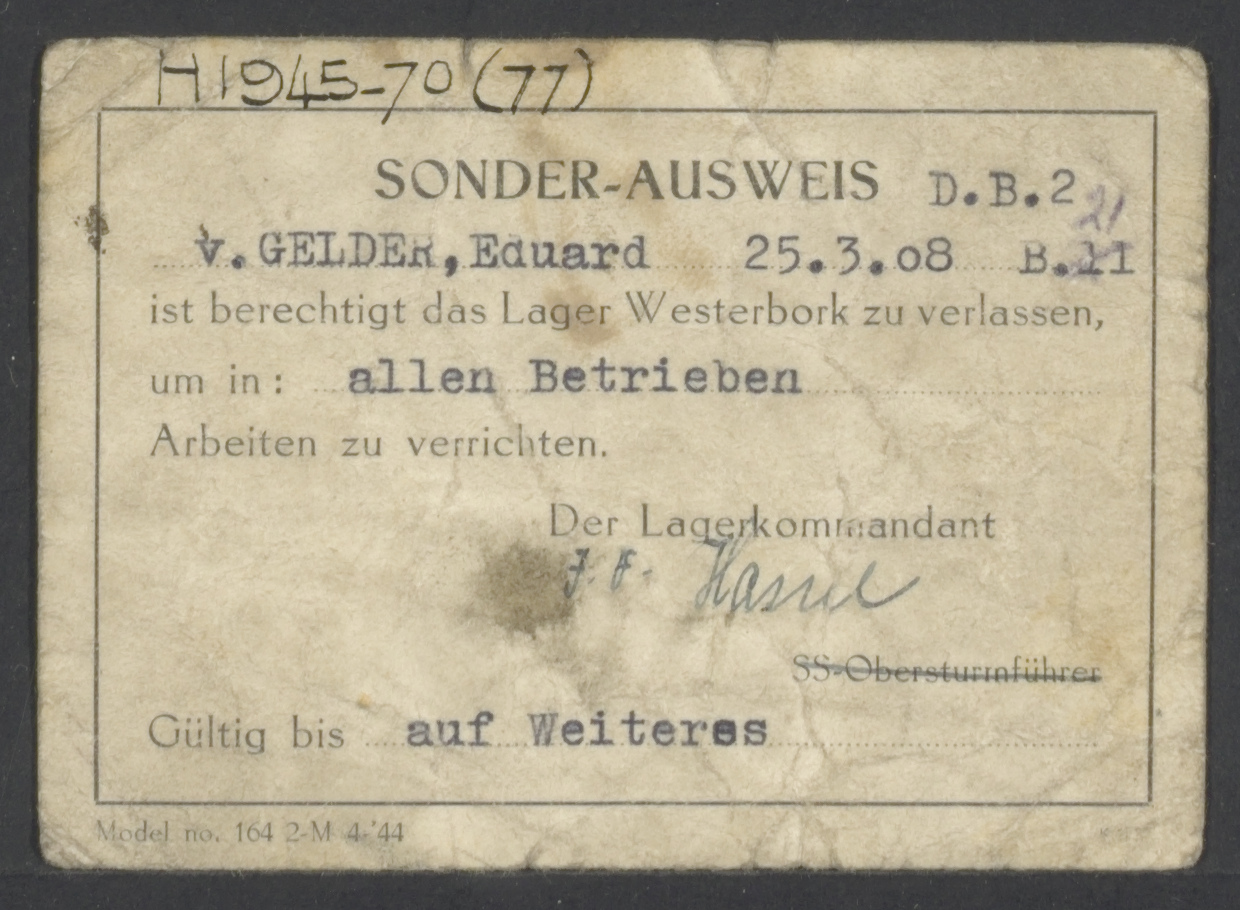 Sonder-Ausweis Van Gelder, Samuel, 18-10-97, B21 ist berechtigt das Lager Westerbork zu verlassen, um in: allen Betrieben Arbeiten zu verrichten (DB 2). Gültig bis: Auf Weiteres