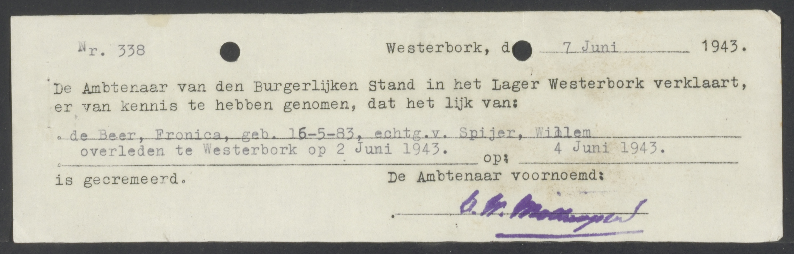 Bewijs van crematie Datum: 07-06-1943 Nr. 338 De Ambtenaar van den Burgerlijken Stand in het Lager Westerbork verklaart, er van kennis te hebben genomen, dat het lijk van: Beer, de, Fronica geb. 16-05-83 overleden te Westerbork op 02-06-1943 op 04-06-1943 is gecremeerd.