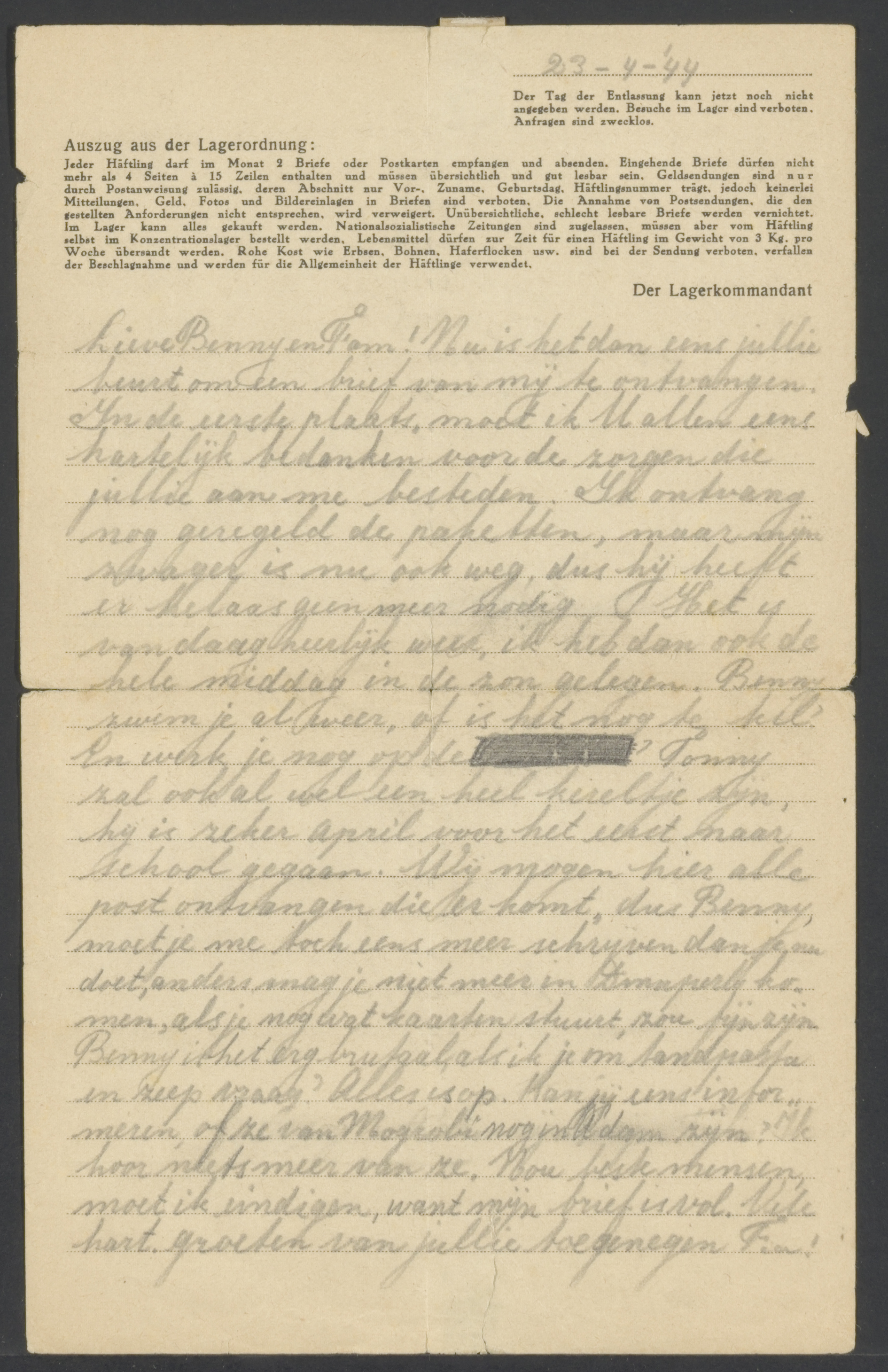 Van: Turfrijer-Voorzanger, S. (De werkelijke schrijfster is Fia Jacobi) Aan: Belterman, B. (in verschillende brieven wordt hij, Benny, genoemd als degene die pakjes toestuurt) Datum: 1944-04-23 Plaats: Herzogenbusch, K.L. (Vught) Onderwerp: hartelijk dank voor de goede zorgen. Ze ontvangt nog geregeld pakketten. Haar zwager is nu ook weg. Fia heeft de hele middag in de zon gelegen. Ze mag alle post ontvangen. Ze heeft behoefte aan tandpasta en zeep. Alles is op.