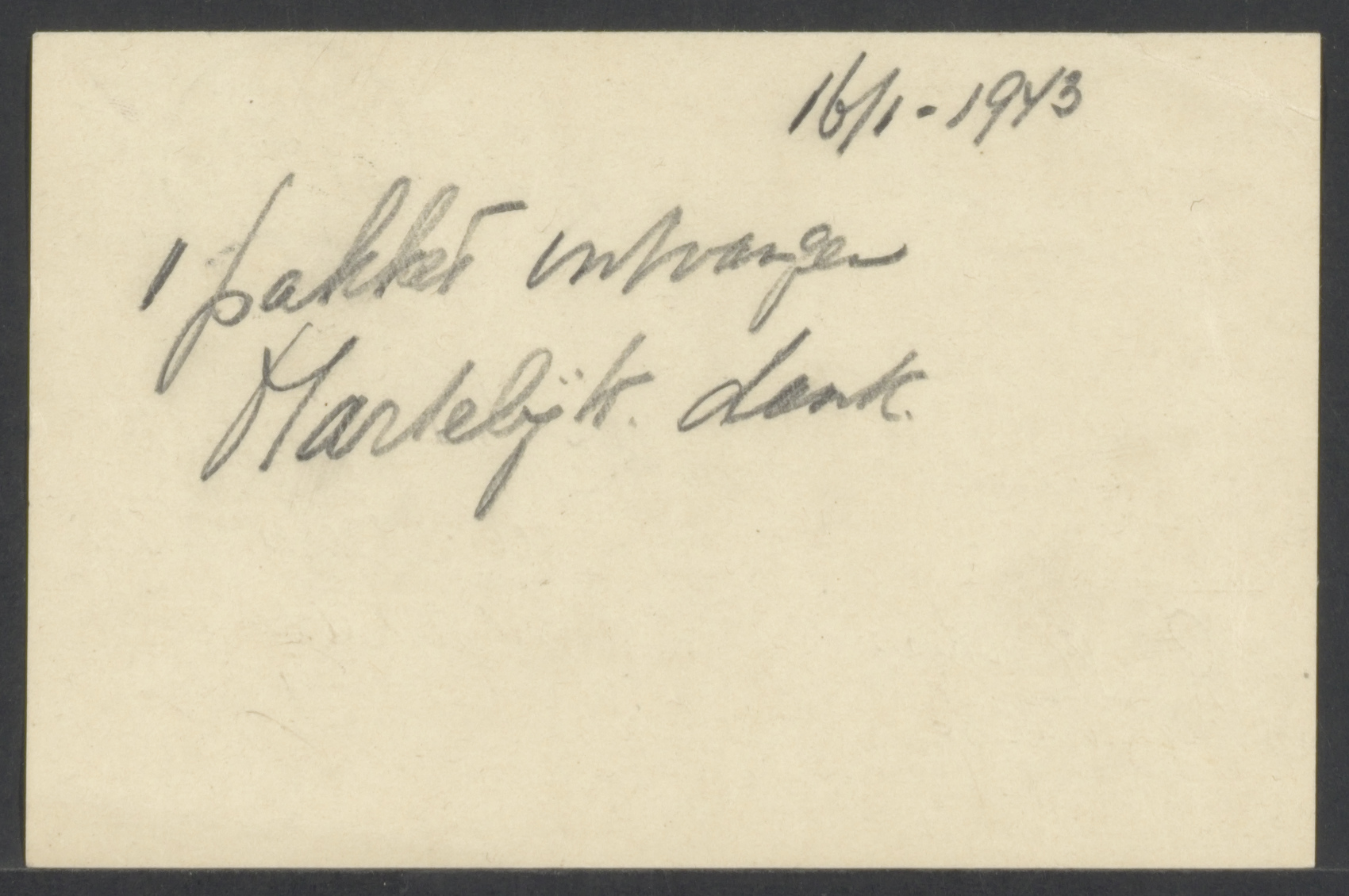 Van: Stranders-Hartog, Rosette, de Aan: Gosschalk, J. Datum: 1942-12-06 Plaats: Westerbork, kamp, barak 36 Onderwerp: drie pakketten en rubberlaarzen ontvangen. Dank…