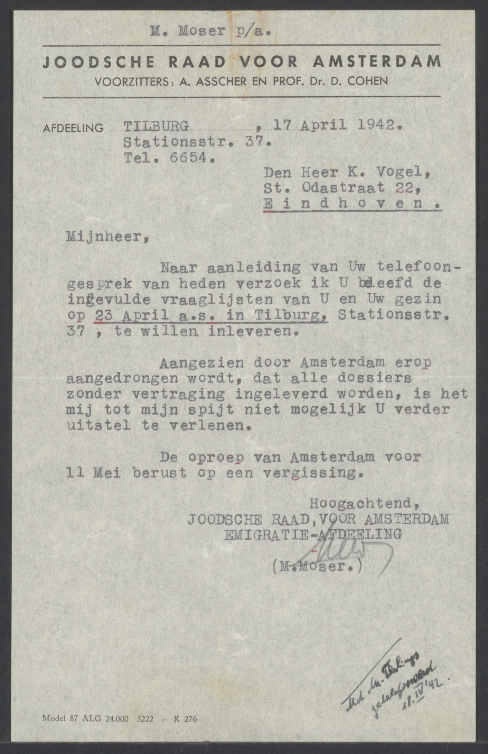 Van: de Joodse Raad voor Amsterdam Aan: Schächter, K. Plaats: Den Haag Datum: 1942-0-26 Onderwerp: richtlijnen voor het schrijven van een brief aan doorgestuurde dochter.