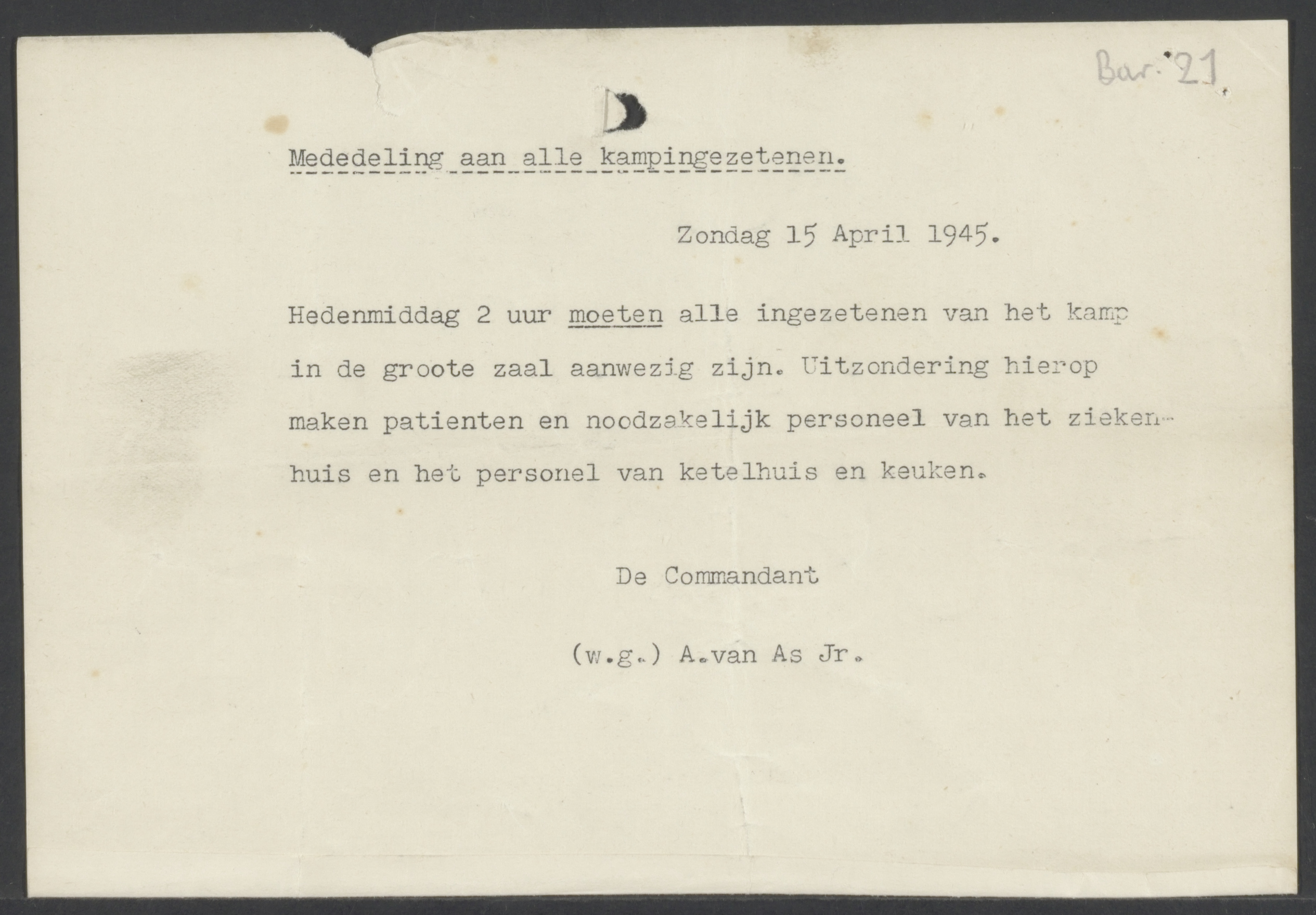 Van: de Dienstleider Aan: Lobstein, A. Plaats: Westerbork, kamp Datum: 1945-02-06 Onderwerp: verzoek aan Adriaan om zich te melden bij Dr. van Zuiden in barak 3 voor een eventuele bloedtransfusie.