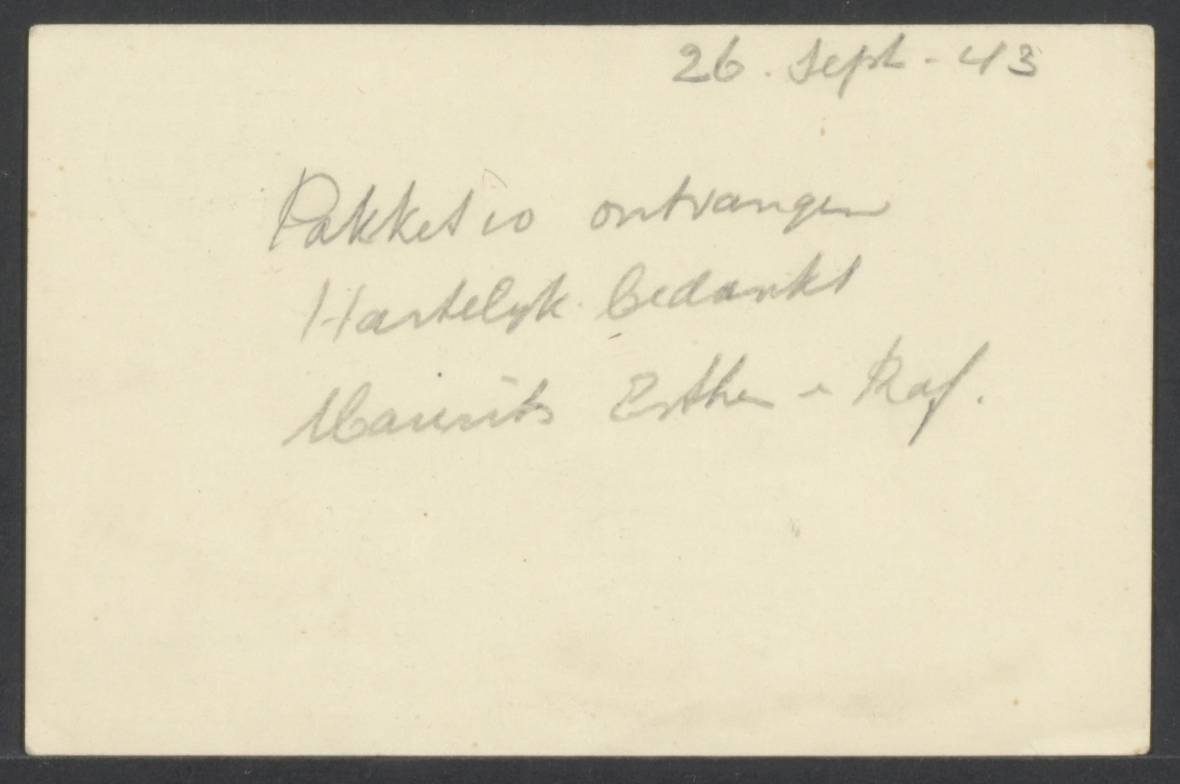 Van: Acohen, Maurits Aan: zijn kinderen Plaats: Theresienstadt Datum: 1944-04-19 Onderwerp: dank voor een ontvangene pakketje.