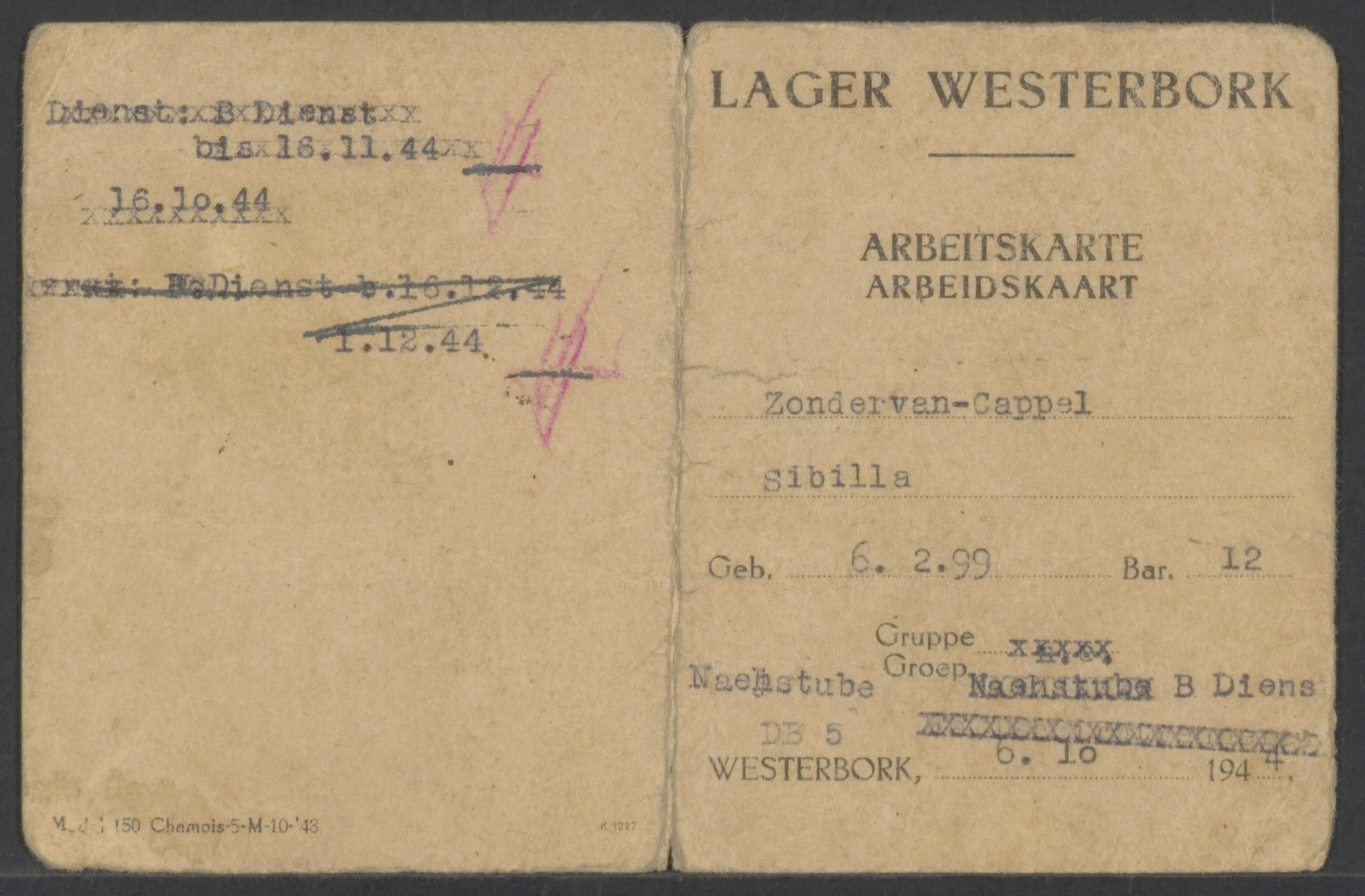 Arbeitskarte van Sibilla Zondervan-Cappel in kamp Westerbork