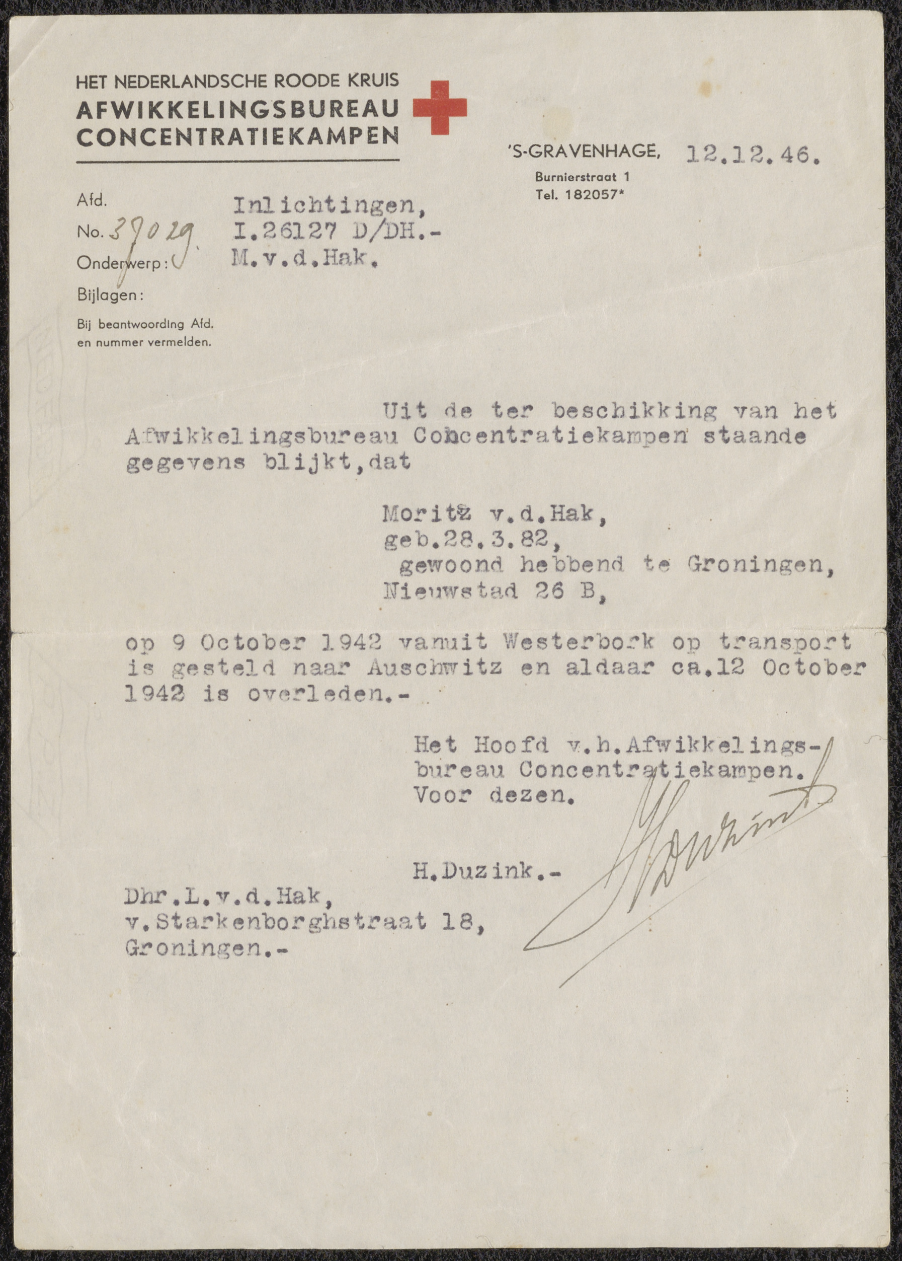 Van: het Rode Kruis, Afwikkelingsbureau Concentratiekampen Aan: v.d. Hak. L. Plaats: Den Haag Datum: 1946-12-12 Onderwerp: over het lot van Moritz v.d. Hak.