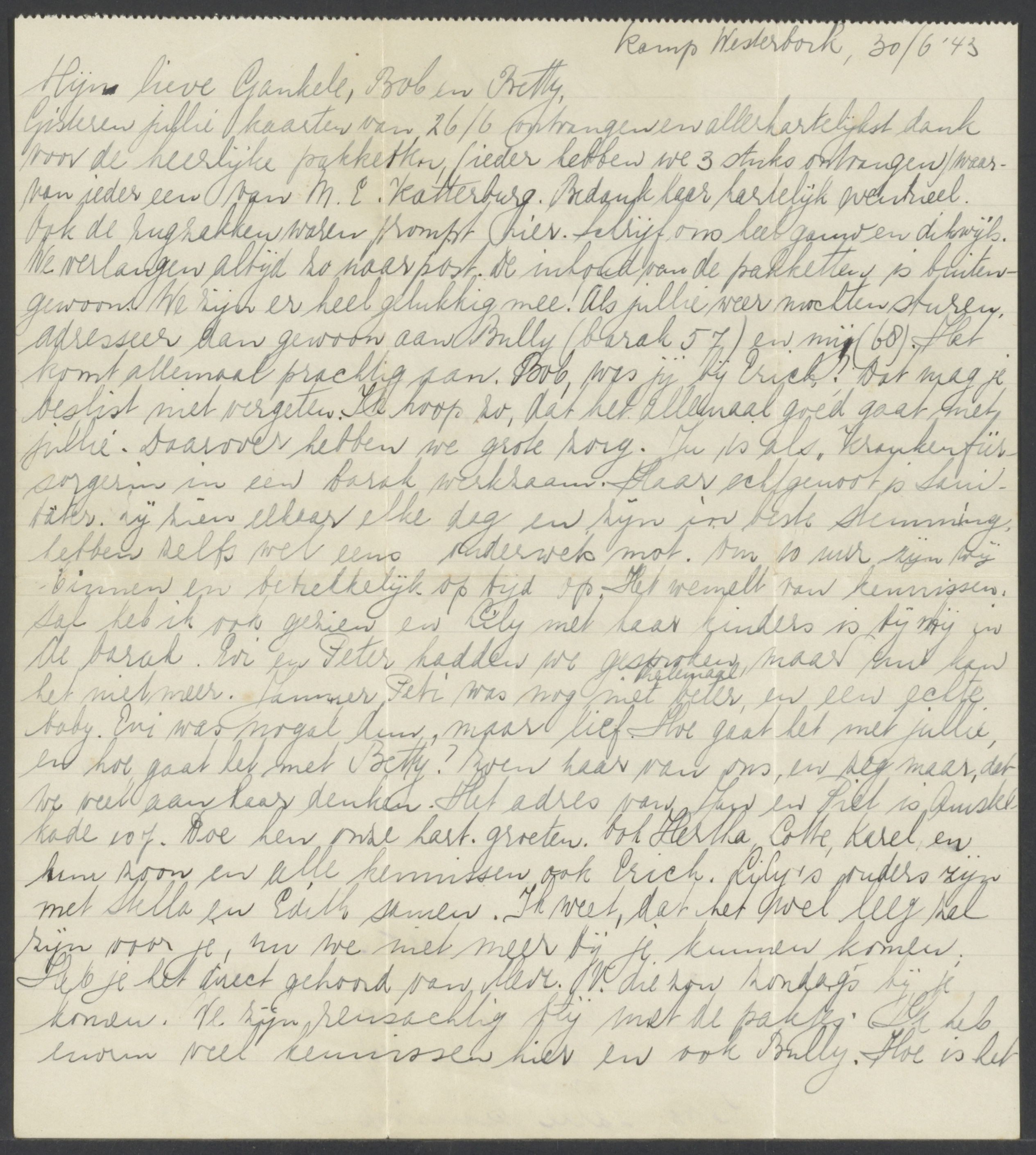 Van: Wollheim Ju en Bully Aan: Bob, Betty en Gankele Plaats: Westerbork, kamp Datum: 1943-06-30 Onderwerp: brieven en pakketten ontvangen, ook de rugzakken; gewoon adresseren naar Bully, barak 57 of ondergetekende, barak 68; Judith is werkzaam al ziekenverzorgster in een barak; Günter is werkzaam als verpleger; het wemelt van de bekenden en kennissen in het kamp en in de barak; de overall van Bully (Günter) is bij de wasvrouw…