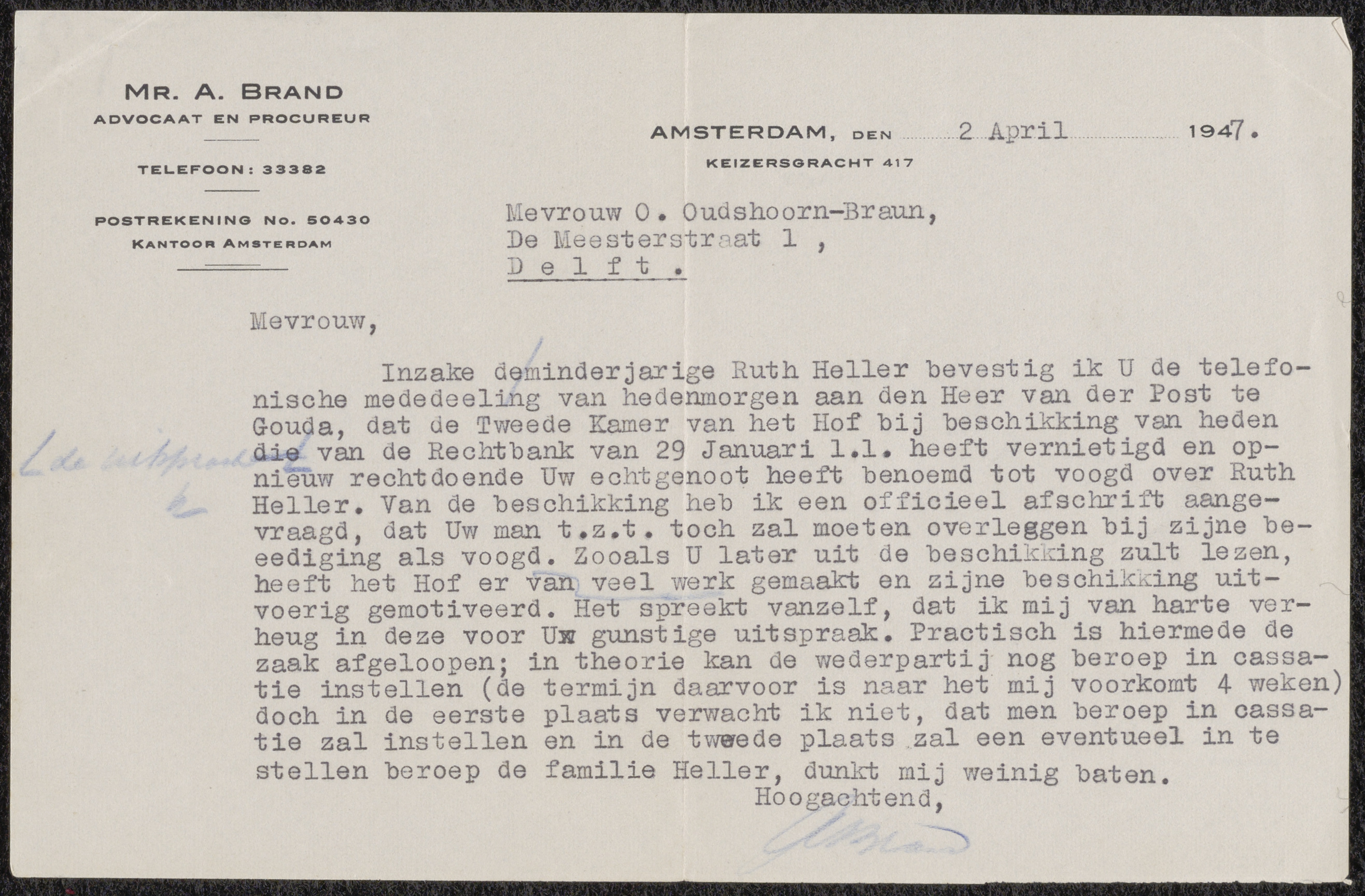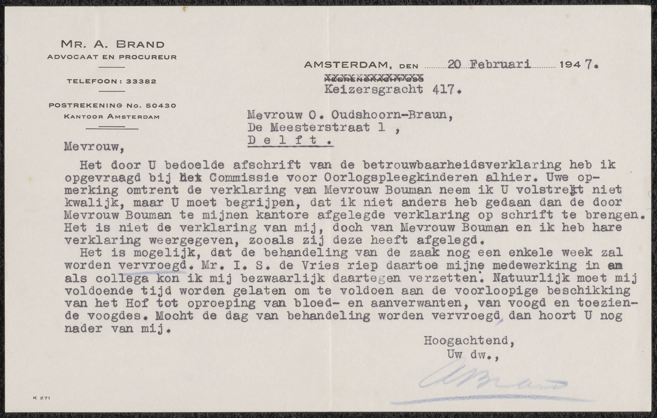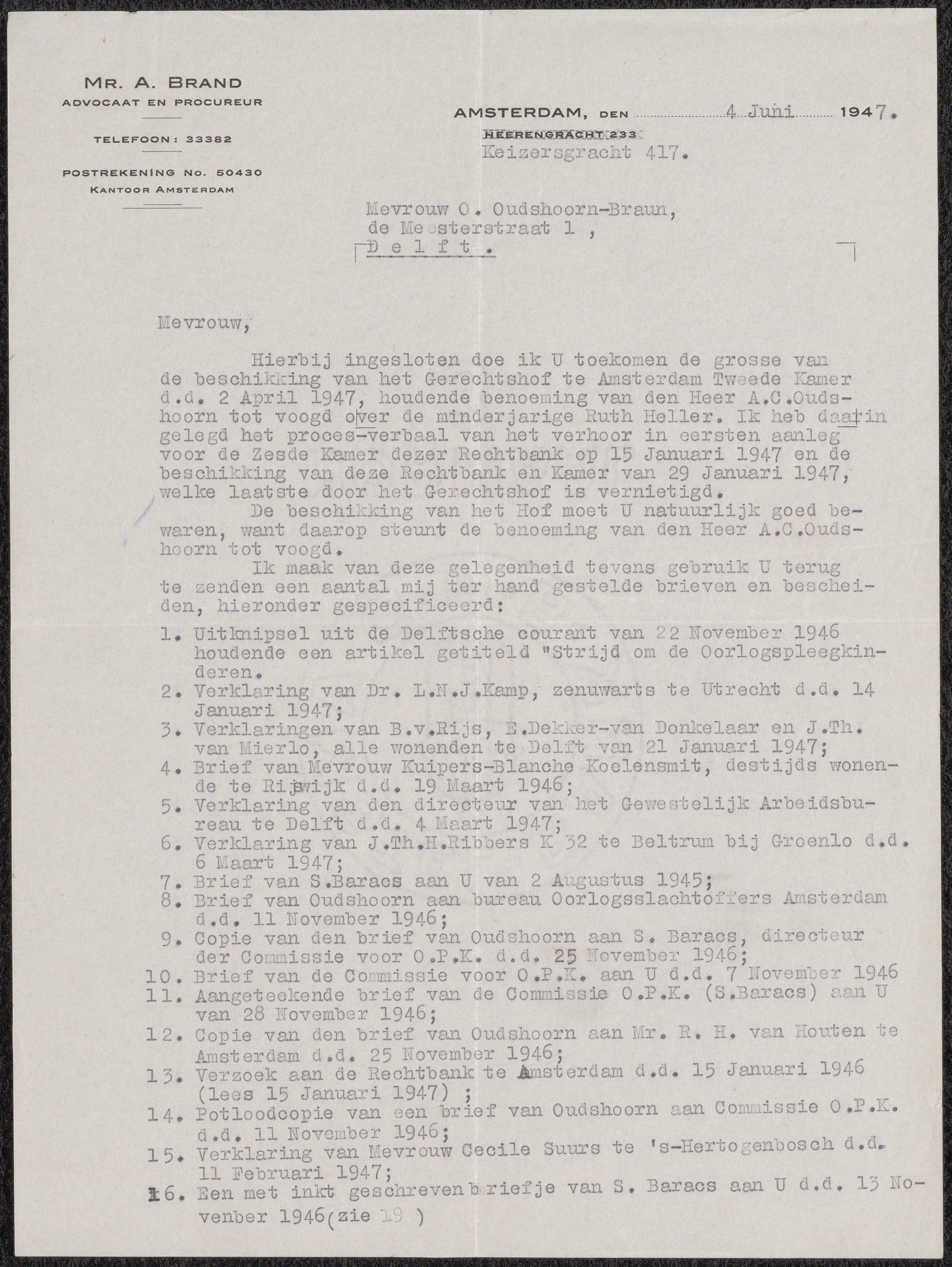 Brief van Mr. Brand te Amsterdam aan mevrouw Oudshoorn-Braun