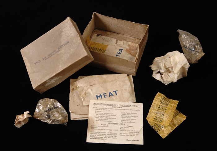 Metalen doosje opschrift (ged) "Tea Ration 5 ozs containig Tea, Sugar and soluble milk powder" en gebruiks aanwijzing. Onderzijde doosje waar Engelse soldaten (WO2) een rantsoen thee in bewaarden. Het bevatte thee, melkpoeder en suiker ca 1944.