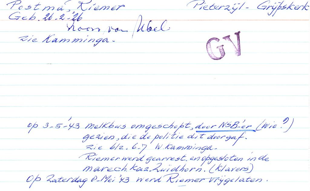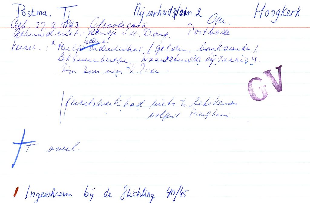 Systeemkaarten met namen van personen uit het verzet: Dirk Postma