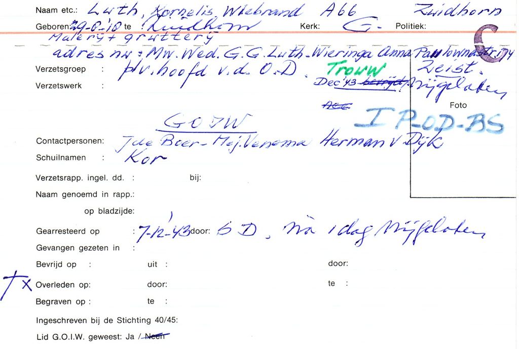 Systeemkaarten met namen van personen uit het verzet: Kornelis Wiebrand Luth