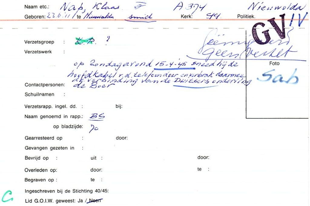 Systeemkaarten met namen van personen uit het verzet: Klaas Roelof Woltjer