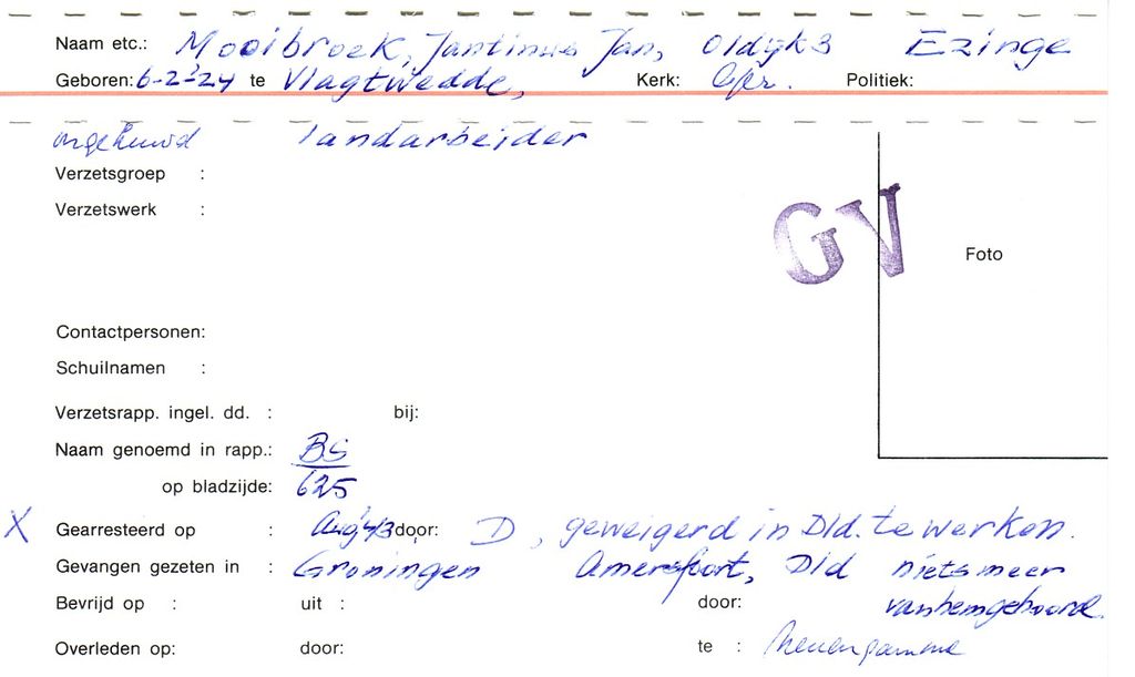 Systeemkaarten met namen van personen uit het verzet: Jantinus Jan Mooibroek