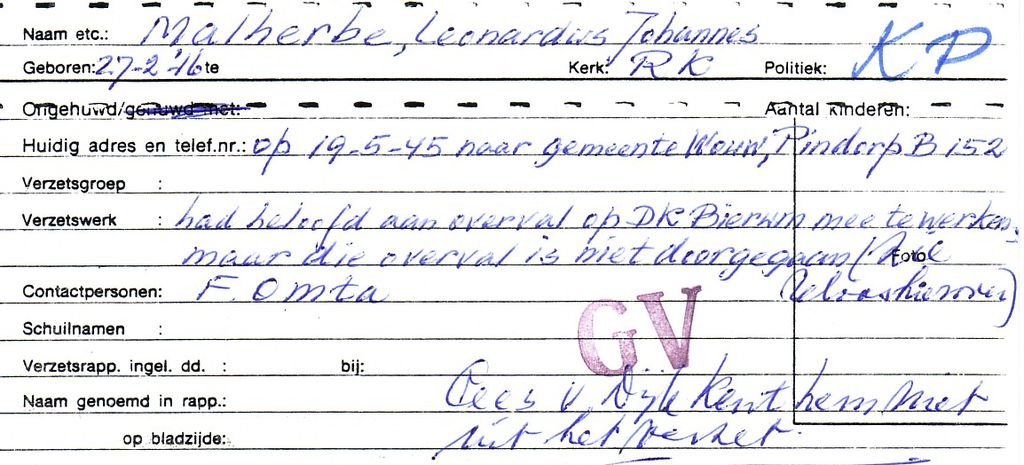 Systeemkaarten met namen van personen uit het verzet: Johannes Leonardus Amerika