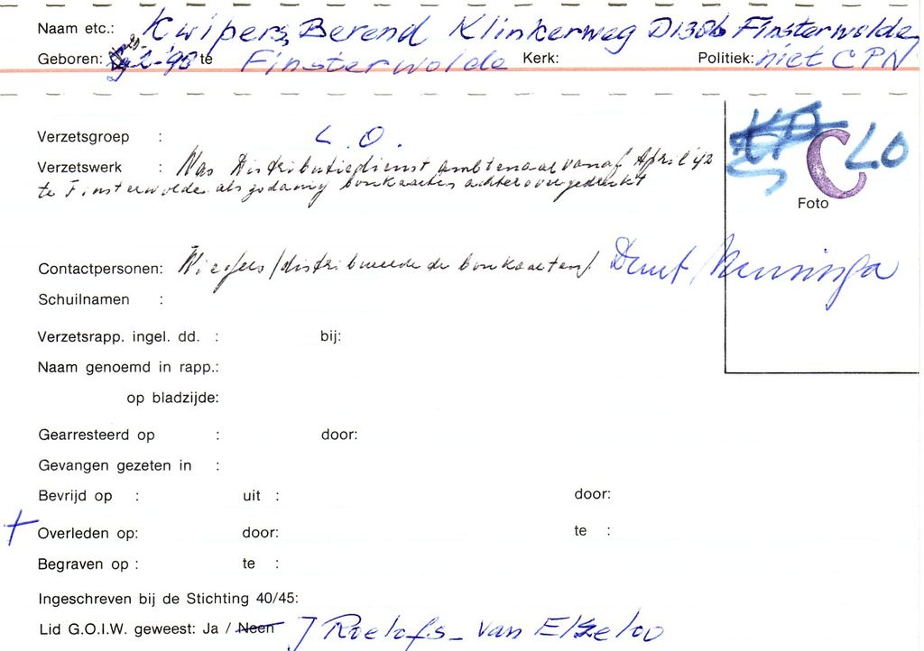 Systeemkaarten met namen van personen uit het verzet: Berend Amsing