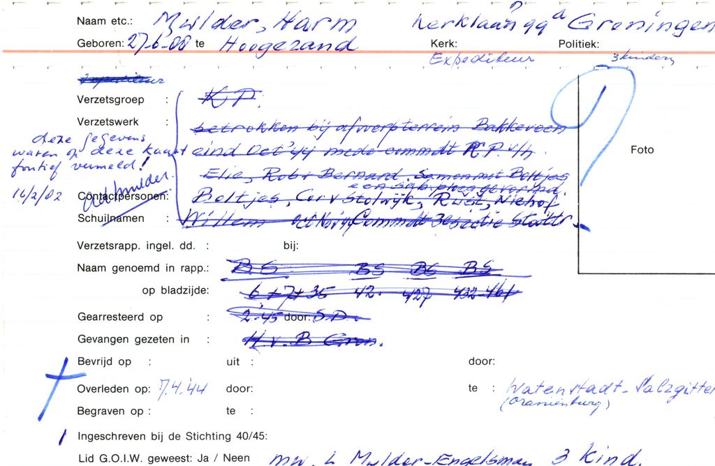 Systeemkaarten met namen van personen uit het verzet: Harm Mulder