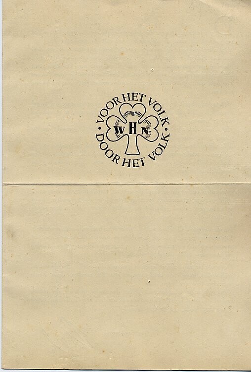 Gevouwen bedelbrief, op de voorkant het logo van de Winterhulp met de tekst: 'Voor het volk, door het volk'. Aan de binnenkant een machtiging voor het storten van geld.