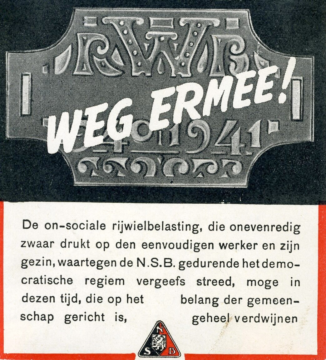 Een pamflet op karton waarin wordt gepleit voor de afschaffing van de rijwielbelasting door de N.S.B. Het bevat het embleem van de N.S.B en een afbeelding van een rijwielplaatje periode 1940-1941 met daaroverheen de tekst 'Weg ermee!'
