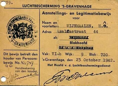 Aanstellings- en Legitimatiebewijs van Luchtbescherming 's-Gravenhage. Op het bewijs staat een stempel van de gemeente 's-Gravenhage met wapen, adres (Wijnmaalen H. A., Azaleastraat 44), 'Blokhoofd', persoonsbewijsnr. 411749, twee handtekeningen e.a.