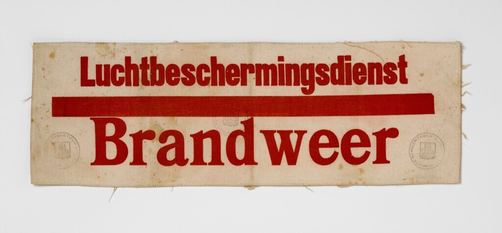 Een witte katoenen mouwband met rode opdruk: 'Luchtbeschermingsdienst - Brandweer' en drie ronde stempels met: 'Gemeentebestuur van Schipluiden' en het wapen van Schipluiden: een zeilschip.
