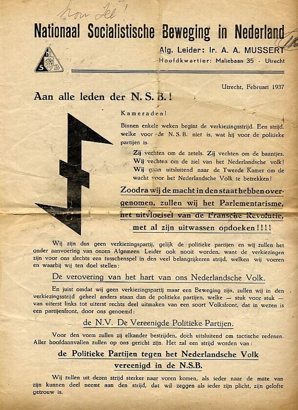 Pamflet van vier pagina's met het symbool van de N.S.B. en de wolfsangel met daarboven de aanhef: "Aan alle leden der N.S.B.!" uitgegeven in het kader van de Kamerverkiezingen van 1937.
