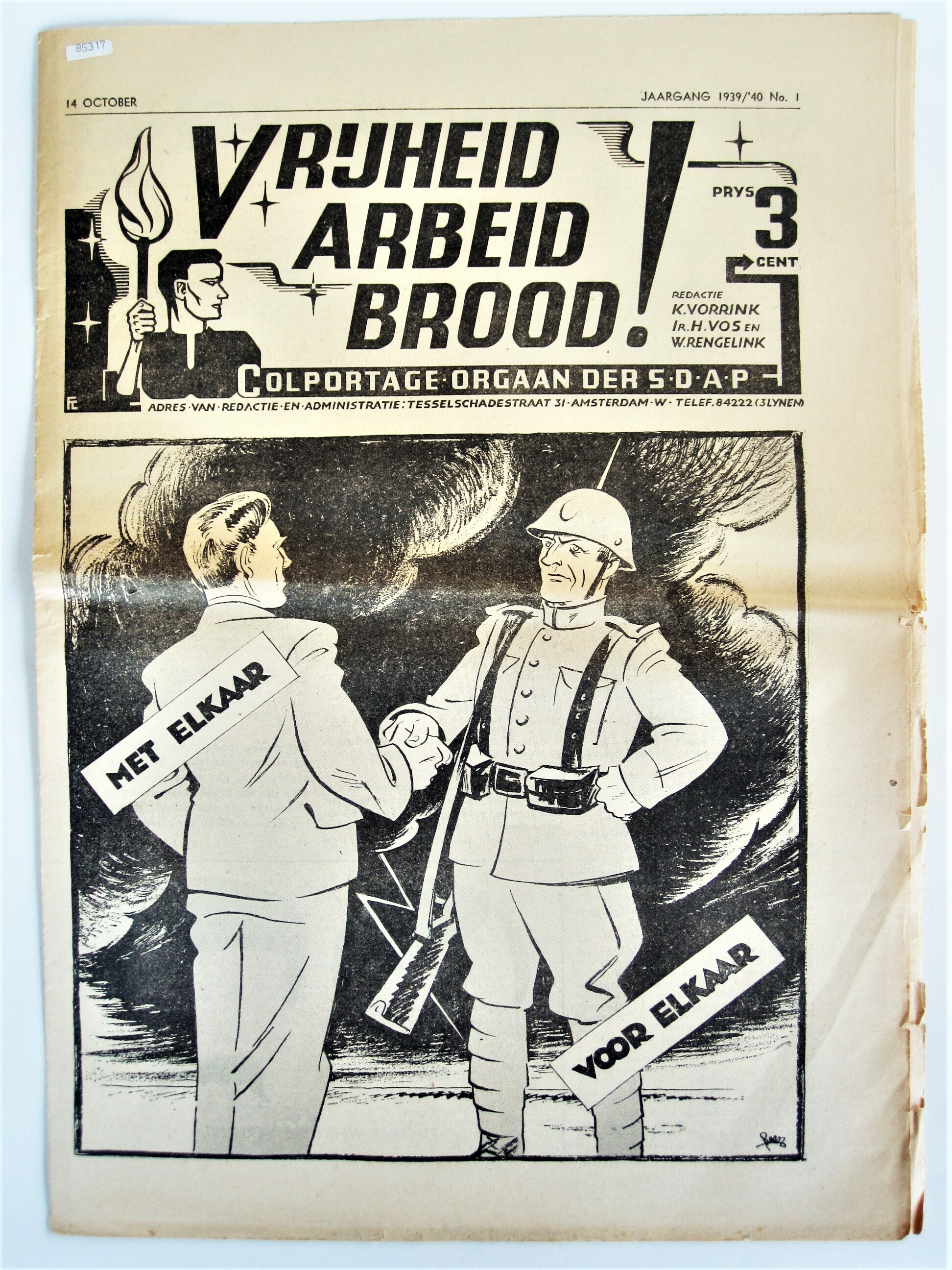 Exemplaren van het periodieke orgaan ''Vrijheid Arbeid Brood! Colportage-orgaan der S.D.A.P.'' Het betreft de nummers 1 (14 oktober 1939) tot en met 29 (4 mei 1940). Nummer 15 ontbreekt. De krant stond onder redactie van o.a. Koos Vorrink. Vrijheid, Arbeid, Brood werd tot 1940 uitgegeven. Het blad streed tegen communisme en fascisme tegelijk en waarschuwde al vroeg tegen Adolf Hitler. Ruim 7000 vrijwilligers verspreidden het blad huis aan huis. De oplage bedroeg zo’n 100.000 exemplaren.