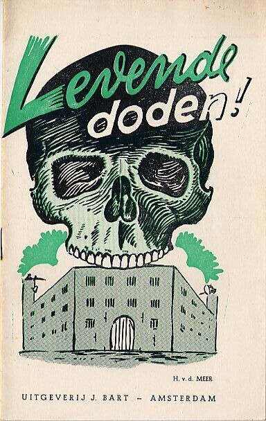 Drie exemplaren van een boekje over het lot van een gevangen genomen illegale werker tijdens de Duitse bezetting. Op de kaft een tekening in groen zwart gedrukt van een schedel boven een gevangenis.
