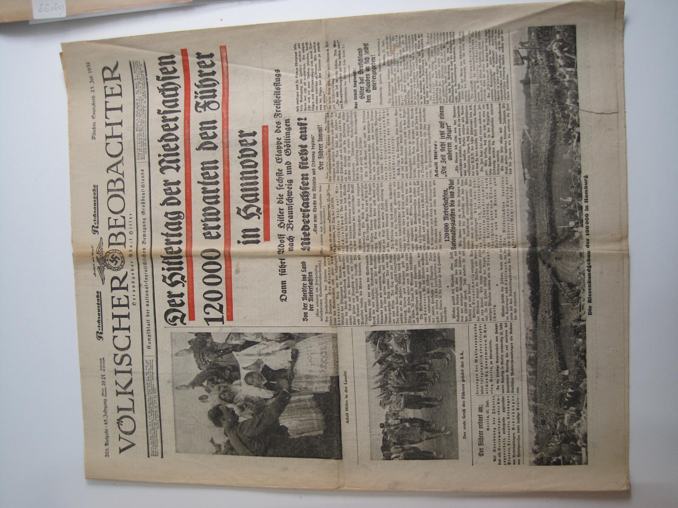 Drie uitgaven van de "Volkischer Beobachter, Kampfblatt der national-sozialistischen Bewegung Grossdeutschlands" jaargang 1932: 23 juli, 27 juli en 2 september.