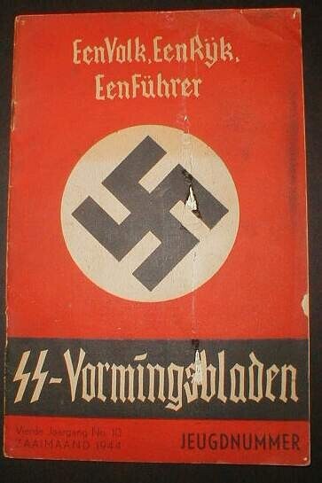Een uitgave van "Een volk, een Rijk, een Führer. SS-Vormingsbladen" voor Nederland, Jeugdnummer, vierde Jaargang, nummer 10, Zaaimand (oktober) 1944, bladzijden 291 t/m 330. Op de rode kaft de afbeelding op een rond wit veld van een zwart hakenkruis.