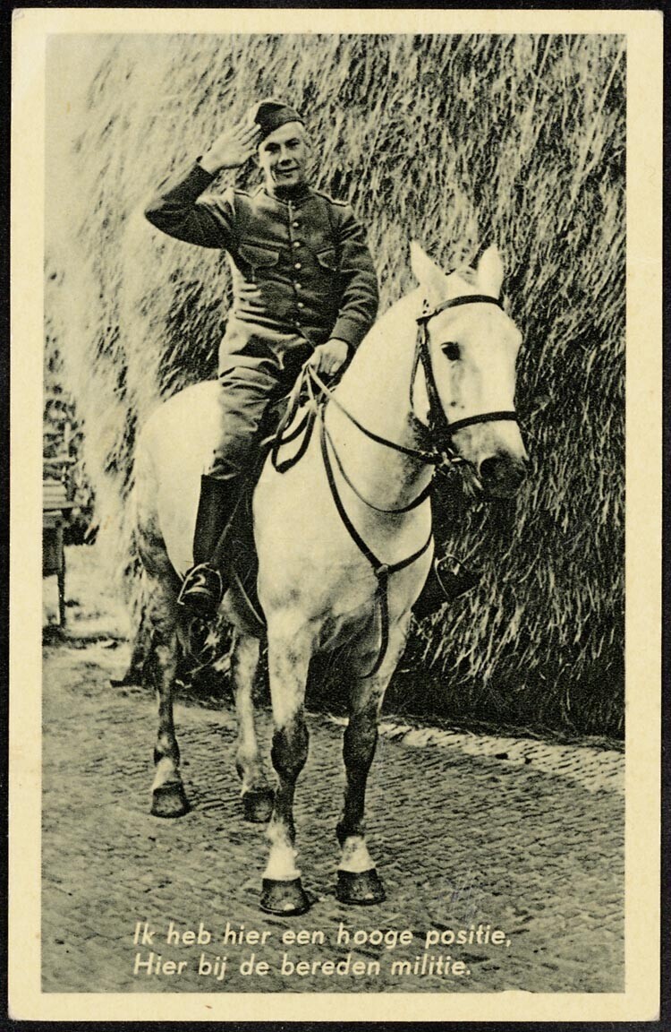Ansichtkaart met een zwartwit foto van een saluerende soldaat te paard. Bijschrift: "Ik heb hier een hooge positie. Hier bij de bereden militie".