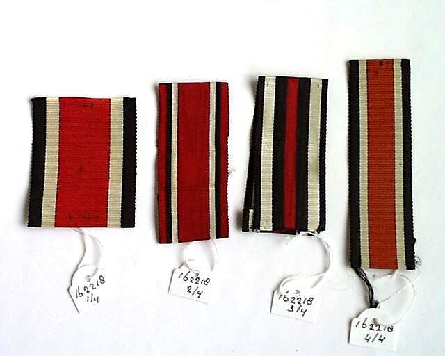 Vier zwart, rood en wit gestreepte linten voor medailles bestemd voor o.a. militairen van de Wehrmacht.