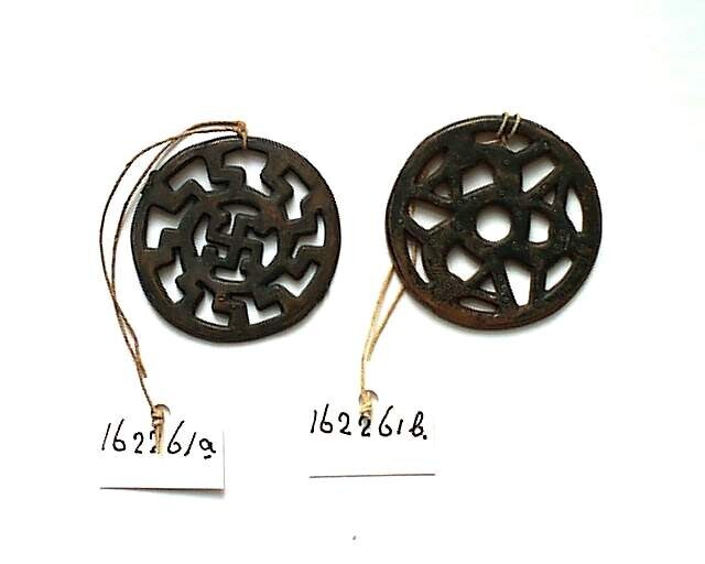 Twee ronde plastic hangers met opengewerkte motieven, waarvan er een met een 'zonnewiel' met in het midden het hakenkruis uitgereikt tijdens een collecte van het Winterhilfswerk in Juni 1941.