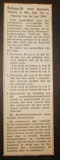 Een krantenknipsel met de oproep voor aanmelding bij de arbeidsdienst.