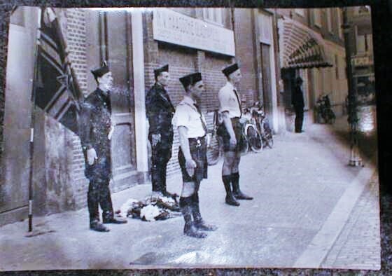 Eeen zwartwit foto van een erewacht in de Balistraat op de plek waar NSB-blokleider Peter Ton op 7 september 1940 werd doodgeschoten.