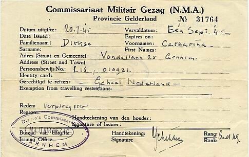 Twee in het Engels en Nederlands voorgedrukte en met pen ingevulde, reisvergunningen uitgegeven door het "Commissariaat Militair Gezag (N.M.A.), Provincie Gelderland" te Arnhem. In een daarvan wordt Catharina Dirkse het recht verleend om in de periode van 13 juni 1945 tot 13 juli 1945 van Arnhem naar Leiden te reizen en terug, en in de andere om tussen 20 juli 1945 tot 1 september 1945 door heel Nederland te reizen. Achterop deze laatste staat met potlood geschreven: "Gerechtigd te reizen met Nederlandse militaire auto's". Op beide vergunningen staan paarse stempels met de tekst: "Militair Gezag, Districts Commissariaat - Arnhem".