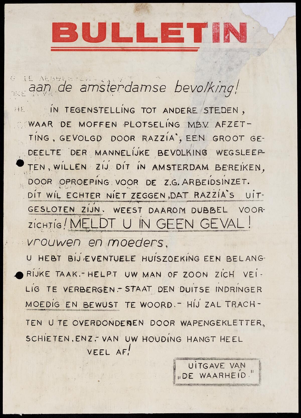 Pamflet gericht aan de bevolking van Amsterdam met een waarschuwing tegen razzia's en een oproep zich niet te melden voor de arbeidsinzet. Uitgave van "De Waarheid". .