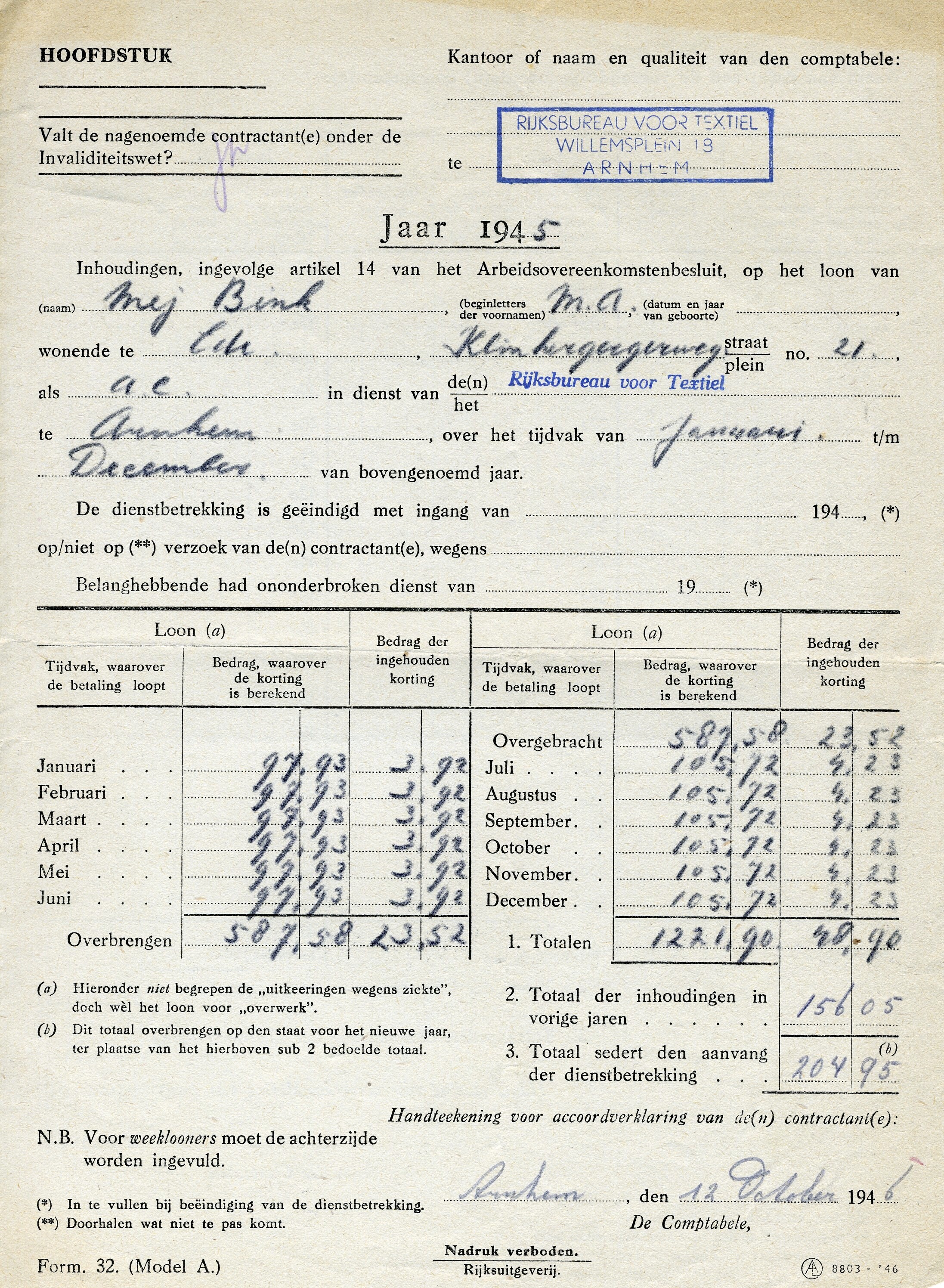 Loonstaat van het Rijksbureau voor Textiel over het jaar 1945 voor de werkneemster M.A. Bink uit Arnhem.