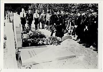 Een zwart-wit foto van het eerbetoon door NSB’ers en nabestaanden bij het graf van de op 7 september 1941 vermoorde WA-man Peter Ton.